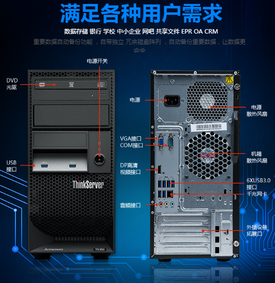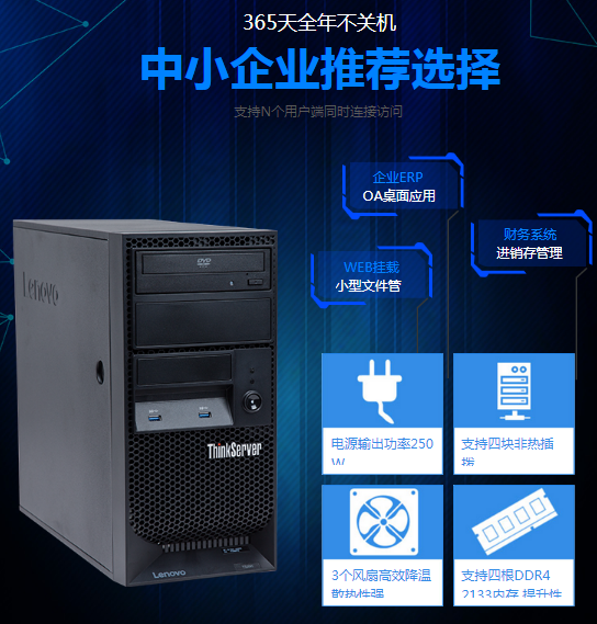 Lenovo ThinkServer TS250是中小企业、远程或分支办事处及零售环境的理想服务器。它采用新技术来提供强大的企业级功能。英特尔® 至强® E3-1200 v6系列处理器包含最多4个内核和集成显卡,而且可支持64GB的 2400MHz DDR4内存。这些特性使您可以比以前更快地运行 更大型工作负载,甚至可以运行虚拟机(VM),进而更高效 地利用服务器。TS250中内置的英特尔® Active Management Technology(AMT)提供了简便易用的行业标准管理工具, 可帮助轻松完成监控、更新和修复工作。TS250能够以接近 高端台式机的价格提供更高的性能。