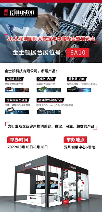 2022深圳国际大数据与存储峰会暨展览会8月16-18日在深圳会展中心举行,全球存储品牌金士顿携高可靠性存储解决方案全面亮相。