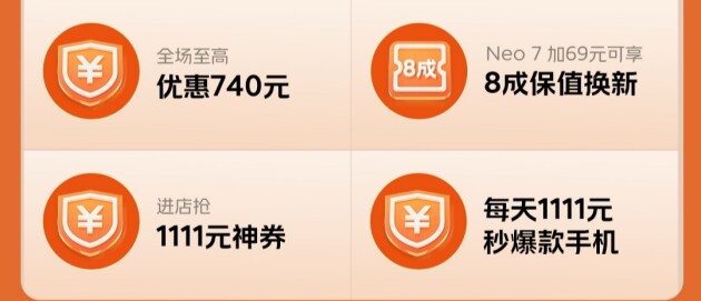 京东双十一购买iQOO手机从10.20晚上8点到11.13全程保价,参与爆款预售活动的用户加赠半年延保,全场爆款赠送5成保值换新,购机全场最高优惠740,享24期免息。购买iQOO Neo7的用户加69元,可享8成保值换新,预售期间每天限量抢100%保值换新。