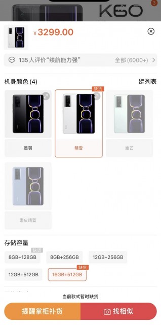 凭借着强大的产品力以及实惠的价格,此番降价的Redmi K60系列产品也顺理成章的销量暴增。截至记者发稿时为止,以晴雪配色为代表的Redmi K60个别版本在天猫及京东等渠道已经开始缺货。