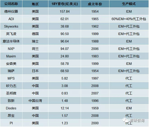 2018年全球主要模拟芯片厂商营收及生产模式,资料来源:智研咨询整理