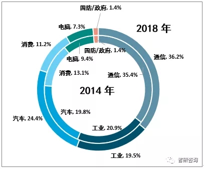2014-2018年模拟芯片应用领域占比变化,资料来源:智研咨询整理
