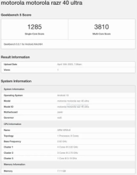 IT采购网4月18日消息,据国外科技媒体MySmartPrice和PhoneArena报道,摩托罗拉Razr 40Ultra手机近日通过GeekBench 5.5.1跑分测试,单核成绩为1285分,多核成绩为3810分。