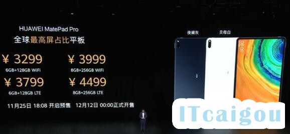 在价格方面,MatePad Pro共有四个版本,其中6GB+128 WLAN版售价 3299 元,8GB+256 WLAN版售价 3999 元,6GB+128 LTE版售价 3799 元,8GB+256 LTE版售价 4499 元,这四个版本将于 11 月 25 日开始预约,12月12日正式开售。