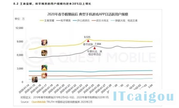 今天春节和以往有些不同,许多人都宅在家里。因而此前一直有消息显示,春节期间腾讯游戏旗下的王牌手游《王者荣耀》日活跃用户破亿。现在,QuestMobile发布了2020中国移动互联网专题报告,在春节期间,《王者荣耀》日活用户峰值达到了9535万。