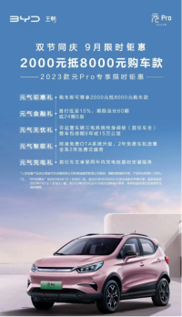 IT采购网9月2日消息,近日,比亚迪汽车发布消息称,他们即将推出一项引人注目的限时钜惠活动,专为其备受瞩目的2023款元Pro车型而设。这一消息在车市引起了广泛关注,预计将会吸引众多消费者前来参与。