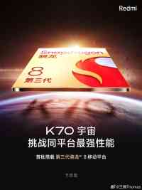 据了解,Redmi K70系列标准版将搭载高通骁龙8 Gen2处理器,而Pro版则升级为高通骁龙8 Gen3。官方宣称这将是同平台最强性能的挑战者。骁龙8Gen3采用了台积电4nm工艺,八核架构设计为1+5+2,其中包括一颗性能强劲的Cortex-X4超大核,性能较前一代提升30%,能效提升20%。此外,RedmiK70 Pro还将支持IP68级防尘防水功能,以及令人瞩目的120W闪充技术。这一系列的全面升级使得Redmi K70 Pro成为备受期待的旗舰手机。