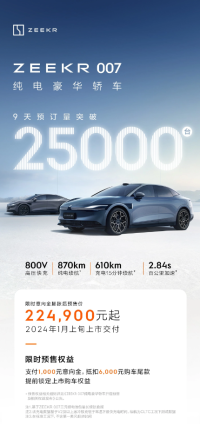 据IT采购网了解,极氪汽车官方今日宣布,007车型在预售开启的短短9天内,已经突破25000台的预订量,展现出强烈的市场吸引力。