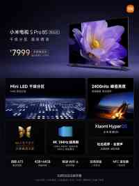 除此之外,Mini LED电视还能更准确地还原画面色彩,呈现更为真实和引人入胜的影片画面。小米电视S Pro MiniLED系列产品涵盖了65英寸、75英寸和85英寸三款不同规格,都标配4K 144Hz VA屏幕,全系列配备MiniLED背光技术,最高具备1440个背光分区和2400nits峰值亮度,同时还搭载了大师级画质引擎。核心处理器采用四核A73处理器,内存容量达到4GB,存储空间为64GB,音响功率高达30W,支持Wi-Fi6,并配备双HDMI 2.1接口,为用户提供更加出色的视听享受。