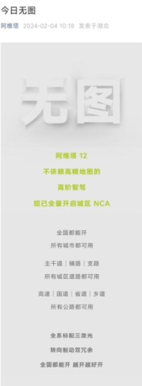 据IT采购网了解,此前鸿蒙智行AITO系列已经推送了无图NCA功能,其在可用路段上的覆盖率高达99%。而阿维塔12此次实现的全量开放无疑将进一步提升其在智能驾驶领域的竞争力,同时也标志着无图NCA技术在更多车型和更广区域的应用落地。这一技术的普及和应用有望为未来的智能交通系统带来更多可能性和创新。