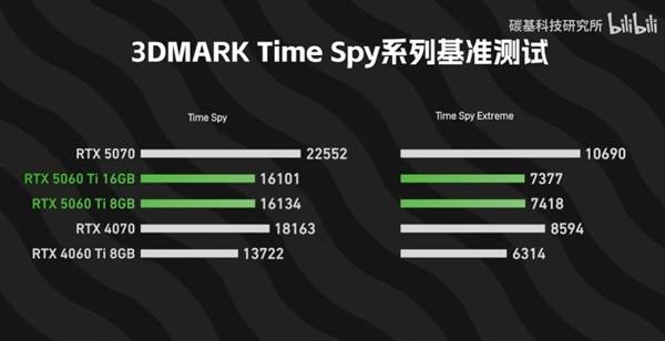 在3DMark Fire Strike基准测试中,RTX 5060 Ti 8GB与16GB版本的分数几乎难分伯仲,相较于前代RTX 4060 Ti 8GB,性能提升最高可达29%。