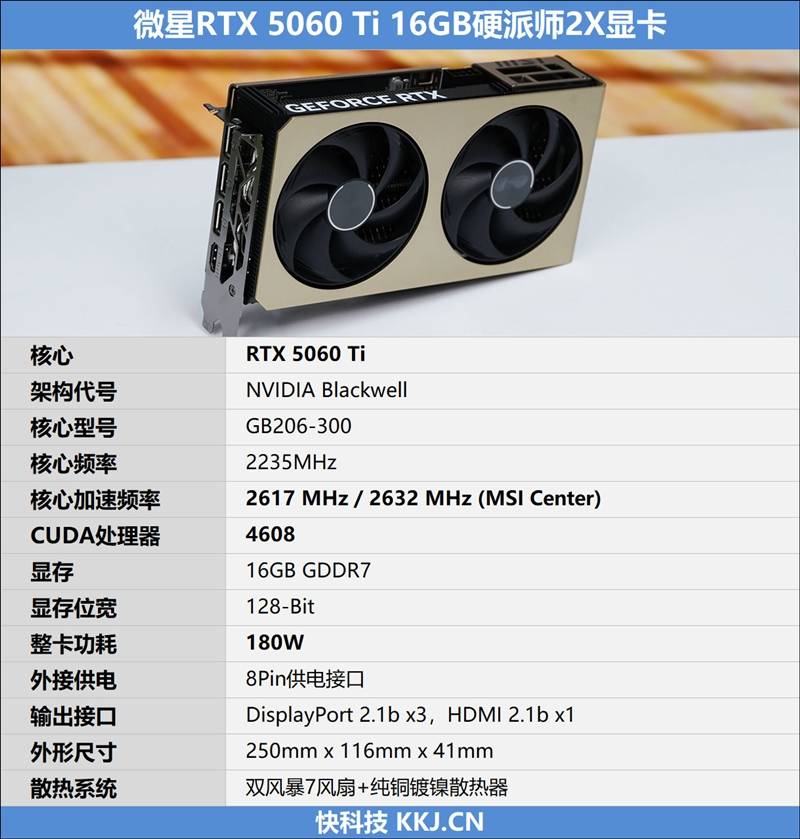 微星RTX 5060 Ti 16GB硬派师2X显卡搭载了NVIDIA最新的Blackwell架构,核心编号GB206-300,内置36组SM单元,拥有4608个CUDA核心。它还配备了144个第5代Tensor Core张量核心和36个第4代RT Core光追核心,支持PCIe 5.0接口,并搭载了16GB GDDR7显存,提供128bit位宽和448GB/s的带宽。在Boost模式下,GPU核心频率可加速至2617MHz,通过MSI Center软件更可进一步提升至2632MHz。