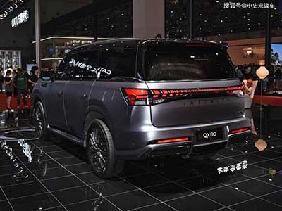 车尾部分,全新英菲尼迪QX80的设计同样方正,车顶配备熏黑扰流板,运动感十足。挡风玻璃下方镶嵌细长镀铬饰条,下方尾门部分采用3D立体贯穿尾灯,内置134颗Micro LED灯珠,支持动态迎宾模式,夜间辨识度极高。保险杠底部采用大面积熏黑饰板包裹,进一步提升了车辆的厚重感。