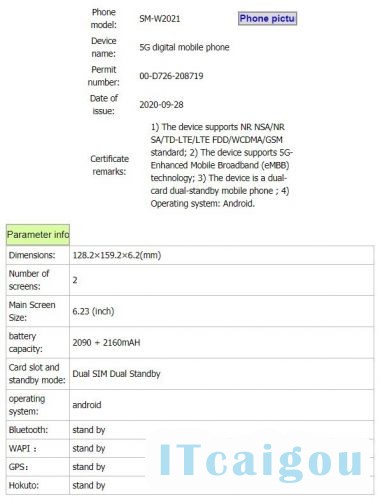当前,工业和信息化部的SM-W2021列表信息最少。该设备的图像尚未出现在工业和信息技术部。列表显示设备尺寸为128.2 x 159.2 x 6.2mm,其主屏幕尺寸为6.23英寸。配备2090mAh + 2160mAh(额定值)双电池。