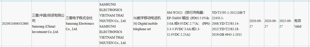 三星W20 5G型号为SM-W2020,3C和工业和信息化部已批准使用SM-W2021的三星设备。尽管尚不知道SM-W2021的最终名称,但推测它可能被正式命名为W21 5G。