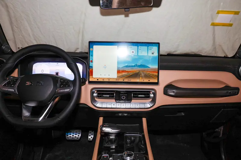 打开车门,BJ40探险家给人别样的惊喜。车内整体布局虽延续老款BJ40,但在仪表台中央换装了一块全新的15.6英寸悬浮式车机大屏,大屏下方原本圆形的空调出风口以及按键区域,也更换为新款BJ40的同款设计。这种“新老拼接”的方式,让整车内部的质感和科技感得到了显著提升。