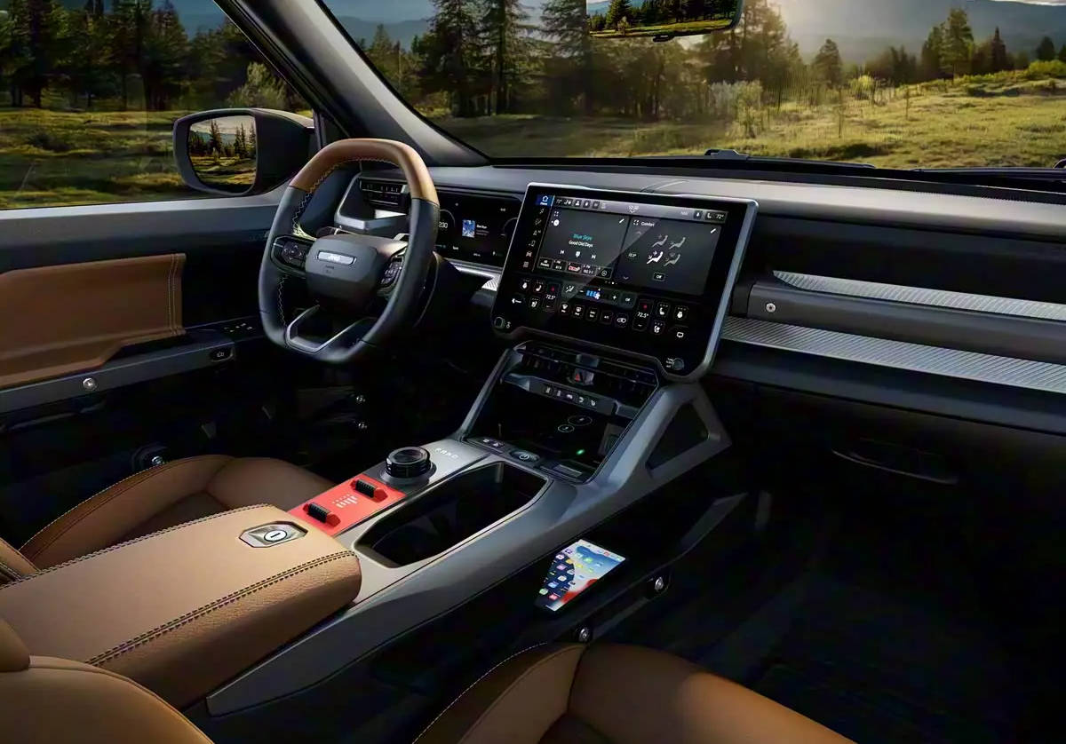 内饰空间布局遵循功能至上原则,横平竖直的线条勾勒出硬朗的座舱轮廓。耐磨材质覆盖的中控台和座椅表面,可有效抵御泥沙侵蚀,方便用户清洁维护。12.3英寸全液晶仪表盘与14.5英寸中控触控屏构成数字化交互核心,同时保留了空调控制等关键物理按键,确保在颠簸路况下的操作可靠性。这种传统与现代的融合设计,既保留了越野车的实用特质,又注入了智能科技元素。