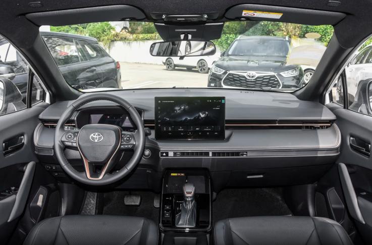 进入座舱,新款锋兰达的内饰布局以简洁流畅的线条为主,空调出风口采用隐藏式设计,中控台呈阶梯式布局,整体风格迎合了年轻消费者的审美。尽管高低配车型在内饰用料上多以硬塑料和搪塑材质为主,但从豪华版开始,消费者可选择撞色内饰方案,长期使用后观感有所提升。这与国产新能源车在用料上的“豪华”风格形成鲜明对比,体现了丰田一贯的“朴素”调性。