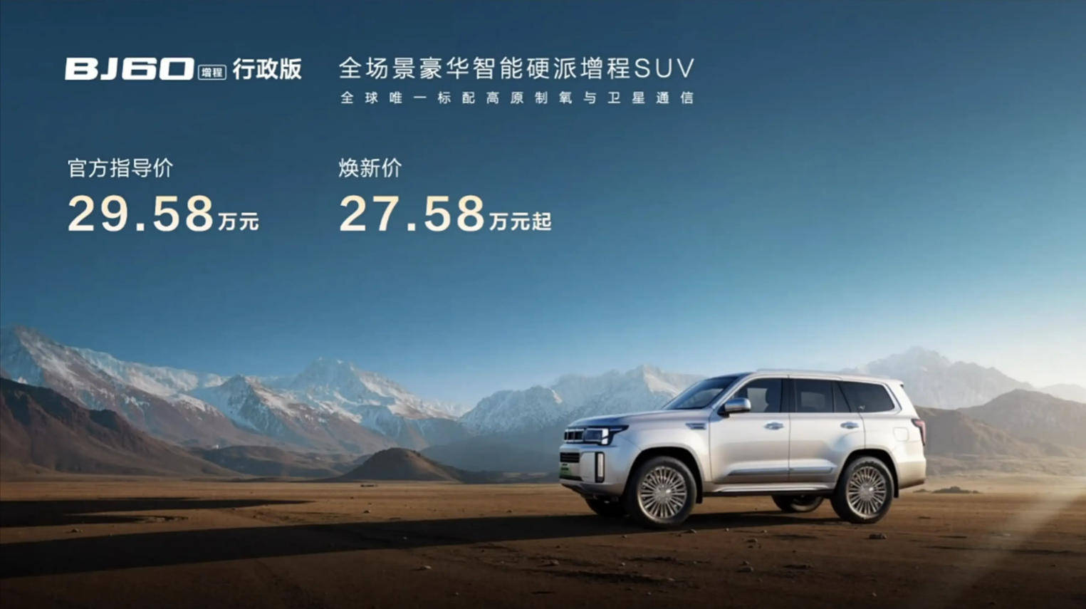 北京越野旗下BJ60增程行政版近日正式登场,官方指导价29.58万元,焕新优惠后售价27.58万元。作为针对特定用户群体打造的专属车型,该版本聚焦西部高原出行场景,在动力系统、通信保障及供氧设备等核心环节实现突破性升级,成为同级市场中唯一同时配备车载制氧机与全域卫星通信功能的SUV车型。