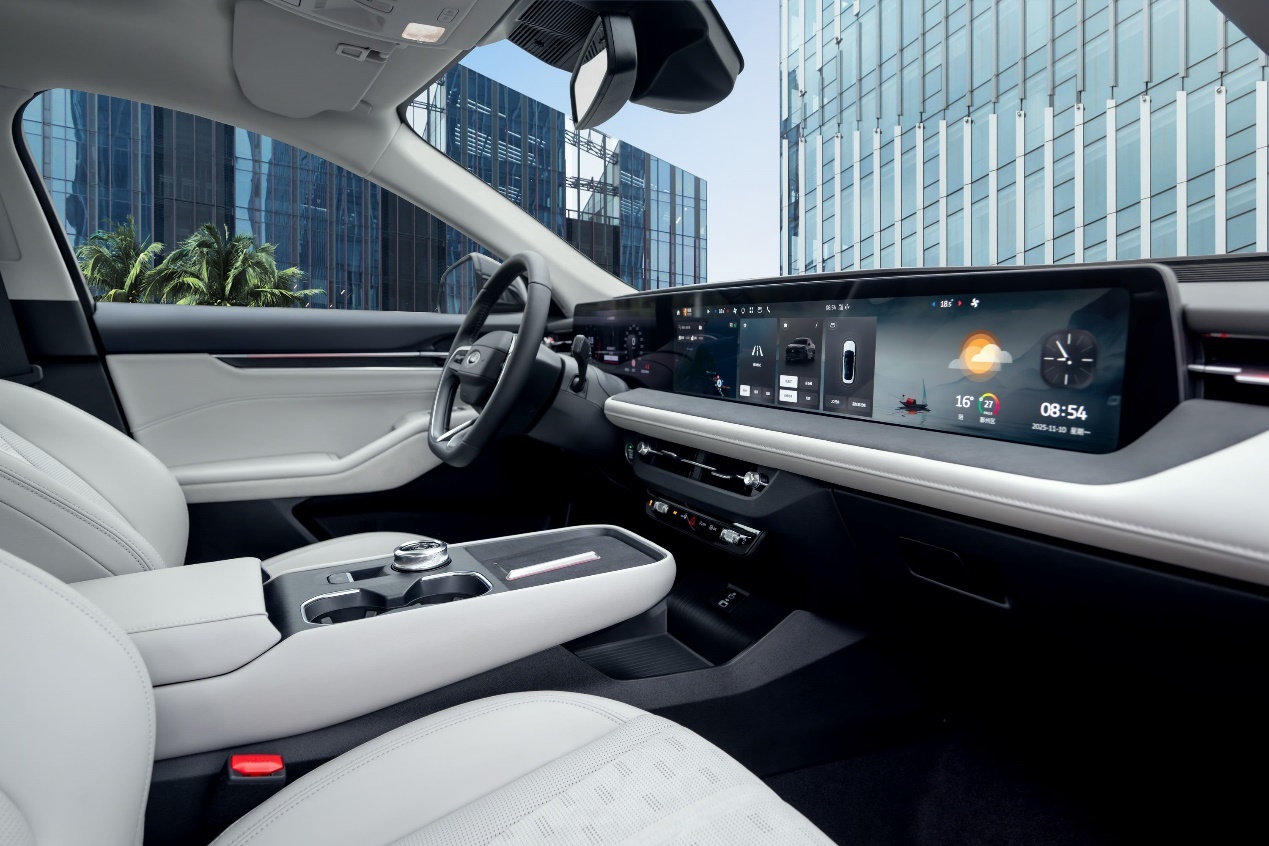 设计语言突破传统框架,将美式肌肉车的力量感与现代美学深度融合。0.29Cd超低风阻系数车身采用“低趴宽体”造型,配合俯冲式腰线与19英寸轮毂,营造出蓄势待发的动态姿态。新增的“赤霞红”与“沧海蓝”专属车色,搭配前脸三条错落式LED灯带与“Ford LED”烫印标识,强化科技辨识度。车内环抱式座舱以机翼轮廓为灵感,1.1米超广域4K悬浮大屏与游艇式悬浮中控台形成视觉焦点,配合丹麦B&O音响系统与全车软质包裹,打造出兼具豪华感与科技感的智慧空间。