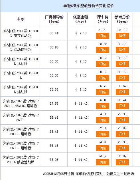 这场价格风暴正在重塑市场格局。奔驰C级通过精准定价策略,在品牌溢价与产品力之间找到新平衡点,迫使竞品重新评估定价体系。消费者端则呈现出明显分化:注重驾驶乐趣的群体仍倾向宝马3系2.0T车型,而追求品牌价值与实用配置的买家则加速向奔驰阵营倾斜。值得关注的是,部分经销商透露,此次降价车型以特定配置版本为主,库存消化后价格可能回调,但豪华B级车市场整体价格中枢已出现结构性下移。