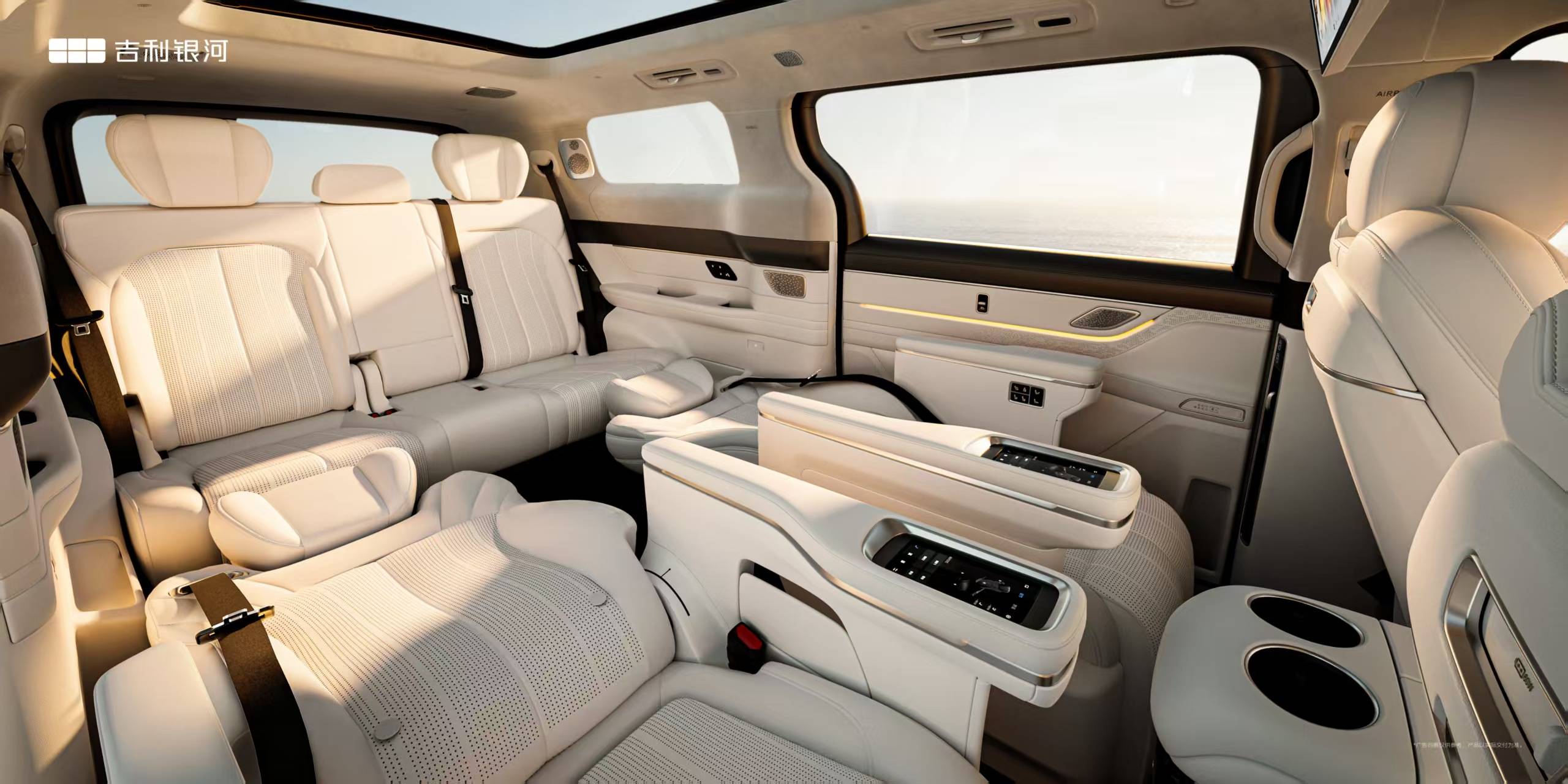 豪华与安全维度,银河V900同样展现出旗舰级实力。由全球设计团队打造的“陆地游艇”造型,将东方美学与现代科技完美融合:“水韵金晖”格栅与“星河长虹”贯穿式日行灯彰显大气格调,内饰则通过“步步高升”仪表台、“如意流风”出风口等细节传递中式哲学。Nappa全粒面真皮座椅采用11层结构设计,提供SPA级舒适体验;27扬声器Flyme Sound音响系统与17.3英寸防夹观影巨幕构建沉浸式座舱。安全方面,2000MPa热成型钢笼式车身、11个安全气囊与神盾电池安全系统通过80余项远超国标的极限测试,形成五重安全防护体系。