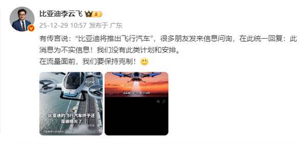 李云飞称,近期收到很多朋友发来的信息询问“比亚迪是否要推出飞行汽车”,在此统一说明,此消息纯属不实。比亚迪目前并没有此类计划和安排。他还提醒大家,在流量盛行的当下,要保持理性克制,不要轻信未经证实的消息。