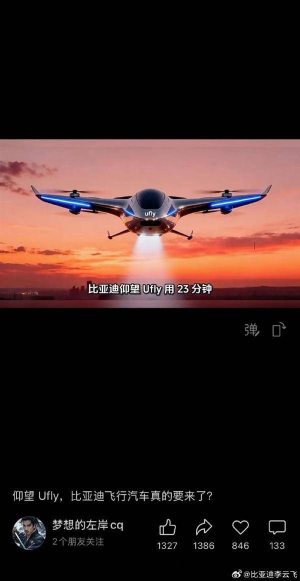 据了解,此次传言源于一些博主的爆料。有博主发文称“比亚迪的飞行汽车终于还是被曝光了”,还提到该飞行汽车搭载兆瓦闪充技术和玄鸟架构。甚至有另一张配图直接将比亚迪飞行汽车命名为“仰望Ufly”。这些信息在网络上迅速传播,引发了众多网友的猜测和讨论。