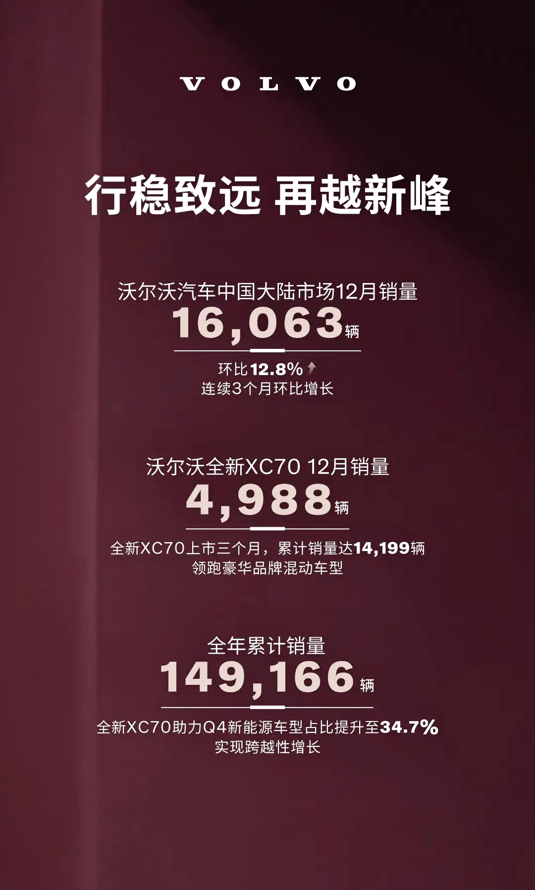 沃尔沃汽车近期公布了最新销售数据,12月单月销量达16063辆,较上月增长12.8%,全年累计销量突破14.9万辆。其中,全新XC70成为品牌销量增长的核心驱动力,上市三个月累计销量已超过1.4万辆,12月单月销量达4988辆,稳居品牌车型销量榜首。