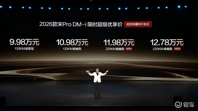 比亚迪近日宣布,旗下2026款宋Pro DM-i长续航版正式上市,共推出两款车型,指导价区间为12.28万元至13.08万元,享受购置税补贴后售价下探至11.98万元至12.78万元。同步推出的133KM车型补贴后售价为9.98万元至10.98万元。作为该系列新增版本,新车以突破220公里的CLTC纯电续航为核心卖点,同时在外形设计、座舱体验和动力性能方面实现全面进化,精准切入家庭用户对经济性与实用性的双重需求。