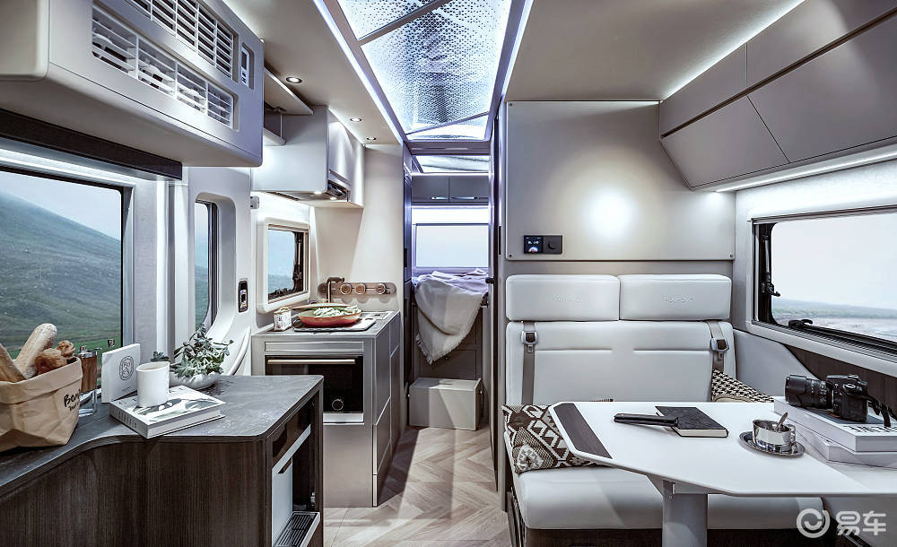 车内空间以米白色为主色调,采用无主灯设计,通过氛围灯带与独立实体按键实现均匀照明。布局采用“前置隐藏床+中置会客区/厨卫+尾置双人床”的模块化设计,提供4座4卧的灵活配置。电动隐藏床(1250×2020mm)与尾床(1250×1980mm)形成垂直分层空间,集成式天窗与阅读灯兼顾通风与私密性。中置双人卡座沙发支持电动靠背调节与横向平移,烤漆实木餐桌防火防水,侧壁铝合金挂钩与嵌入式插座提升实用性。隐藏式吊柜与开放式储物格组合,满足轻质衣物与随身物品的分类收纳需求。