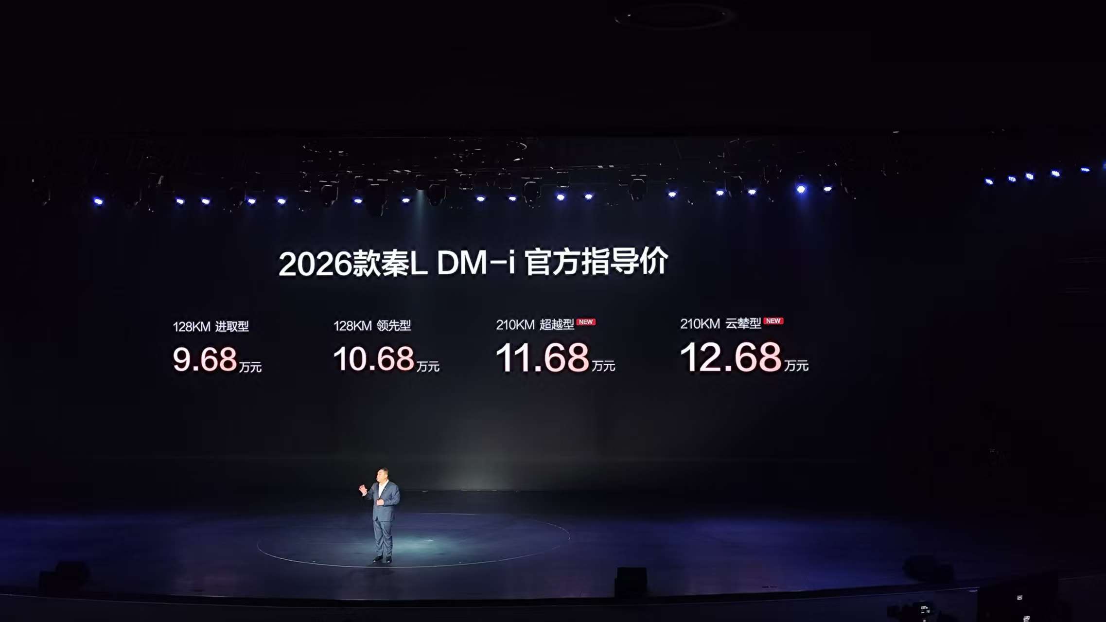 比亚迪正式推出2026款秦L DM-i与秦PLUS DM-i长续航版车型,两款新车均实现纯电续航里程的重大突破,最大续航里程达210公里。其中秦L DM-i 210KM长续航版推出2款配置,官方指导价区间为11.68-12.68万元,叠加购车权益后实际售价下探至11.28-12.28万元;秦PLUS DM-i 210KM长续航版同样提供2款车型,售价区间为8.98-9.98万元。购车用户还可享受1.1-1.5万元的专项权益补贴。