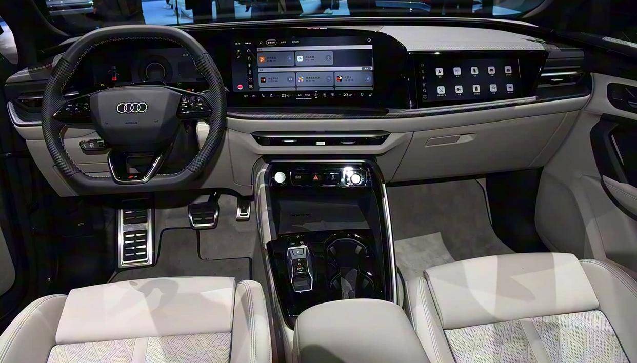 内饰方面,全新奥迪Q5L彻底摒弃了老款车型的设计,采用了大尺寸曲面联屏。11.9英寸仪表盘和14.5英寸中控屏的组合,形成了强大的视觉冲击力。13.1英寸HUD抬头显示和副驾10.9英寸娱乐屏的加入,让前排乘客几乎被各种屏幕包围。内饰还配备了多种氛围灯,并加入了激光雷达,进一步提升了科技感。可以说,奥迪依然保持着其在科技配置方面的领先地位。