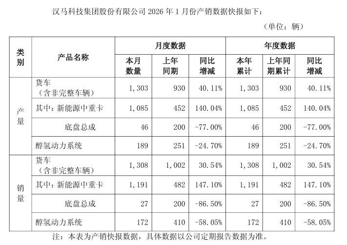 汉马科技近日公布了2026年1月的销售数据,显示其底盘总成与醇氢动力系统的销量均出现显著下滑。具体来看,当月底盘总成销售量为27套,与去年同期相比大幅下降86.50%。这一数据反映出市场对底盘总成的需求明显减弱,可能受到行业整体环境或竞争态势的影响。