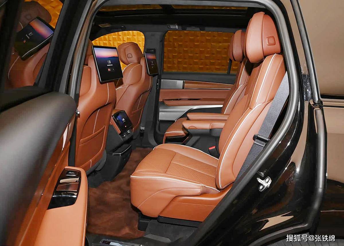 内饰空间突破传统豪华定义,全车搭载5块智能屏幕形成沉浸式交互矩阵。中控台上方悬浮着33英寸弧形超视网膜屏,下方8英寸触控屏与副中控台形成功能分区。两辐式方向盘创新融入木纹饰板与镀铬元素,在科技感中注入经典美学。后排区域配备三块独立屏幕,分别位于前排座椅靠背与中央扶手后方,配合B柱及扶手箱后部的空调出风口,构建出全维度舒适体验。