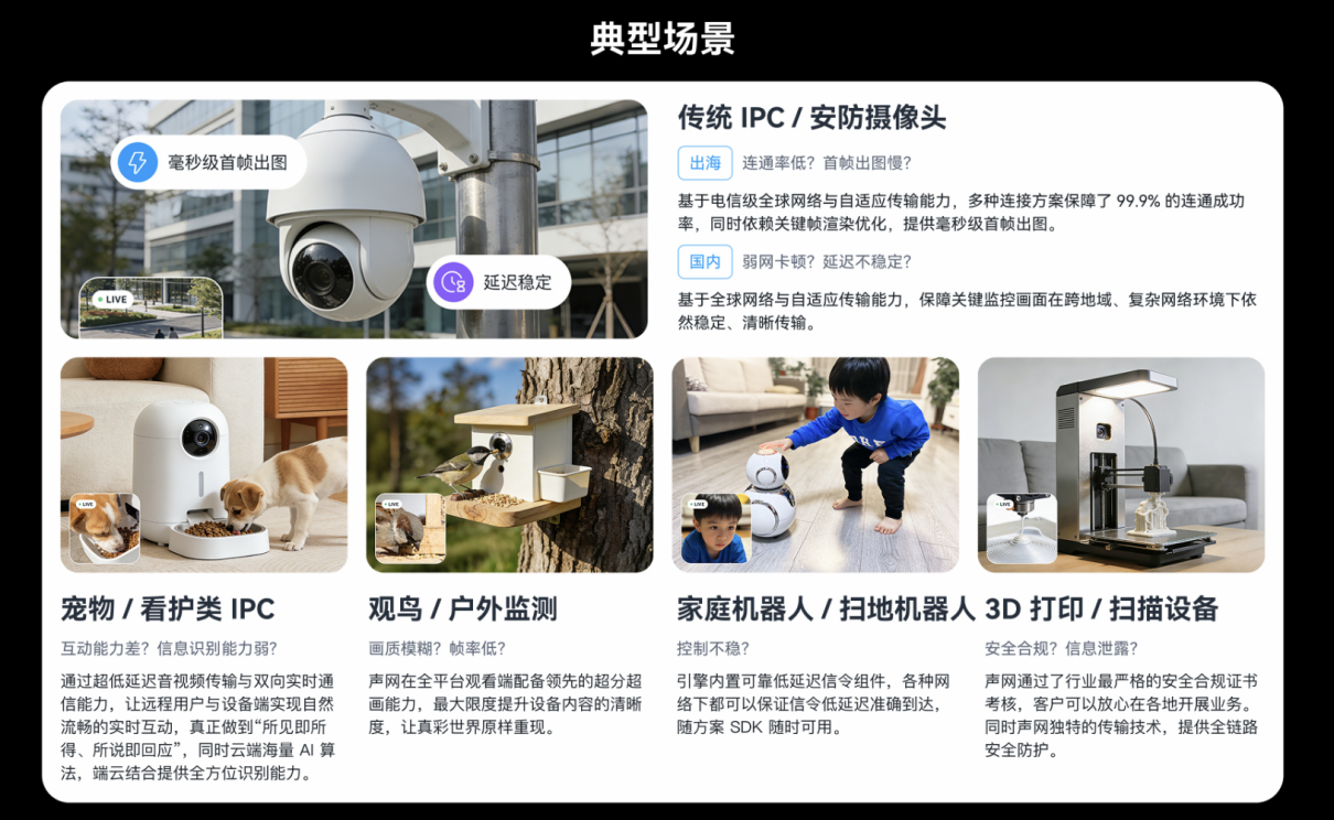 针对物联网设备的连接痛点,声网同步推出的泛IPC解决方案提供四大核心能力:依托自研SD-RTN™网络实现的全球覆盖,确保东南亚等网络薄弱地区设备激活成功率超99.9%;专利编解码算法在80%丢包环境下仍保持流畅传输;端云协同AI架构支持宠物检测、行为分析等场景算法的云端加载;多端互通技术突破传统P2P方案的人数限制,同时满足全球合规要求。这些能力组合,精准解决了摄像头、扫地机器人等设备的实时交互难题。