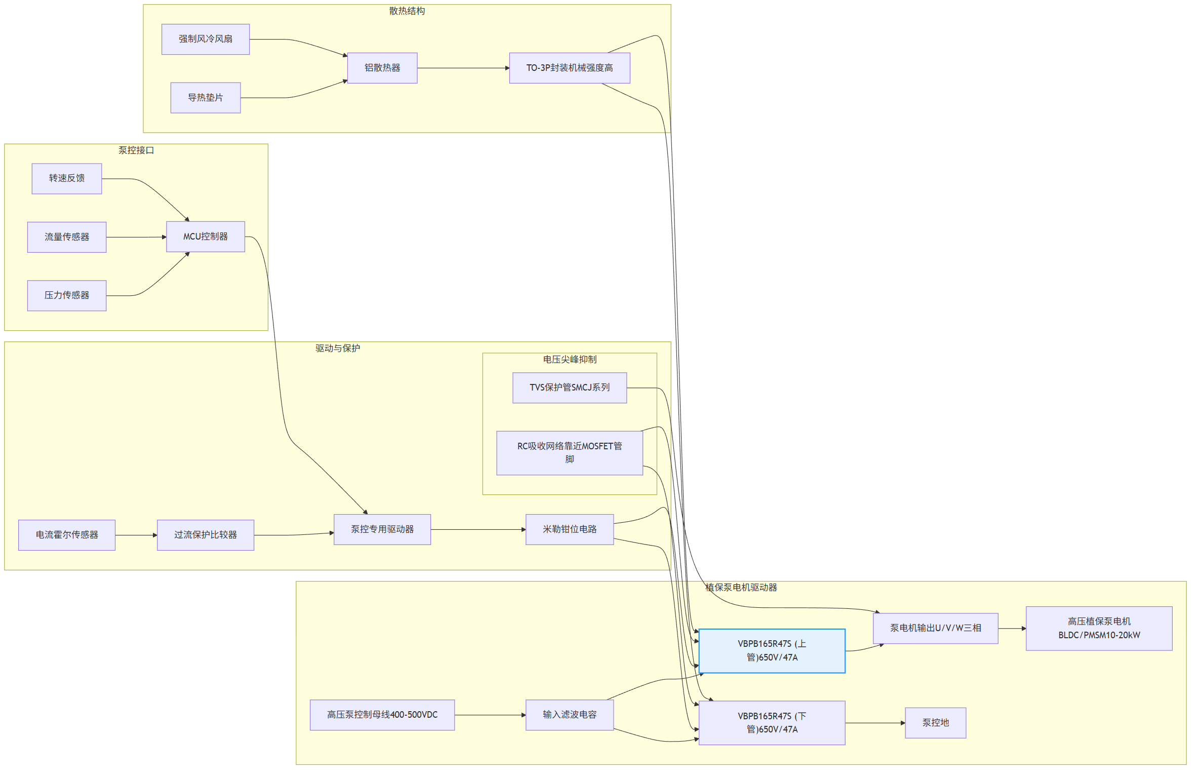 高压植保泵控制场景对器件耐压与开关可靠性要求严苛。推荐采用VBPB165R47S超结MOSFET,其650V耐压与50mΩ导通电阻特性,可直接适配400V-500V车载电池平台。TO3P封装结合低热阻设计,使器件在高频开关状态下仍能保持稳定结温。针对泵电机启停时的液体负载突变,方案建议配置RC吸收网络或TVS管抑制电压浪涌,同时采用具有米勒钳位功能的隔离驱动芯片优化开关波形。