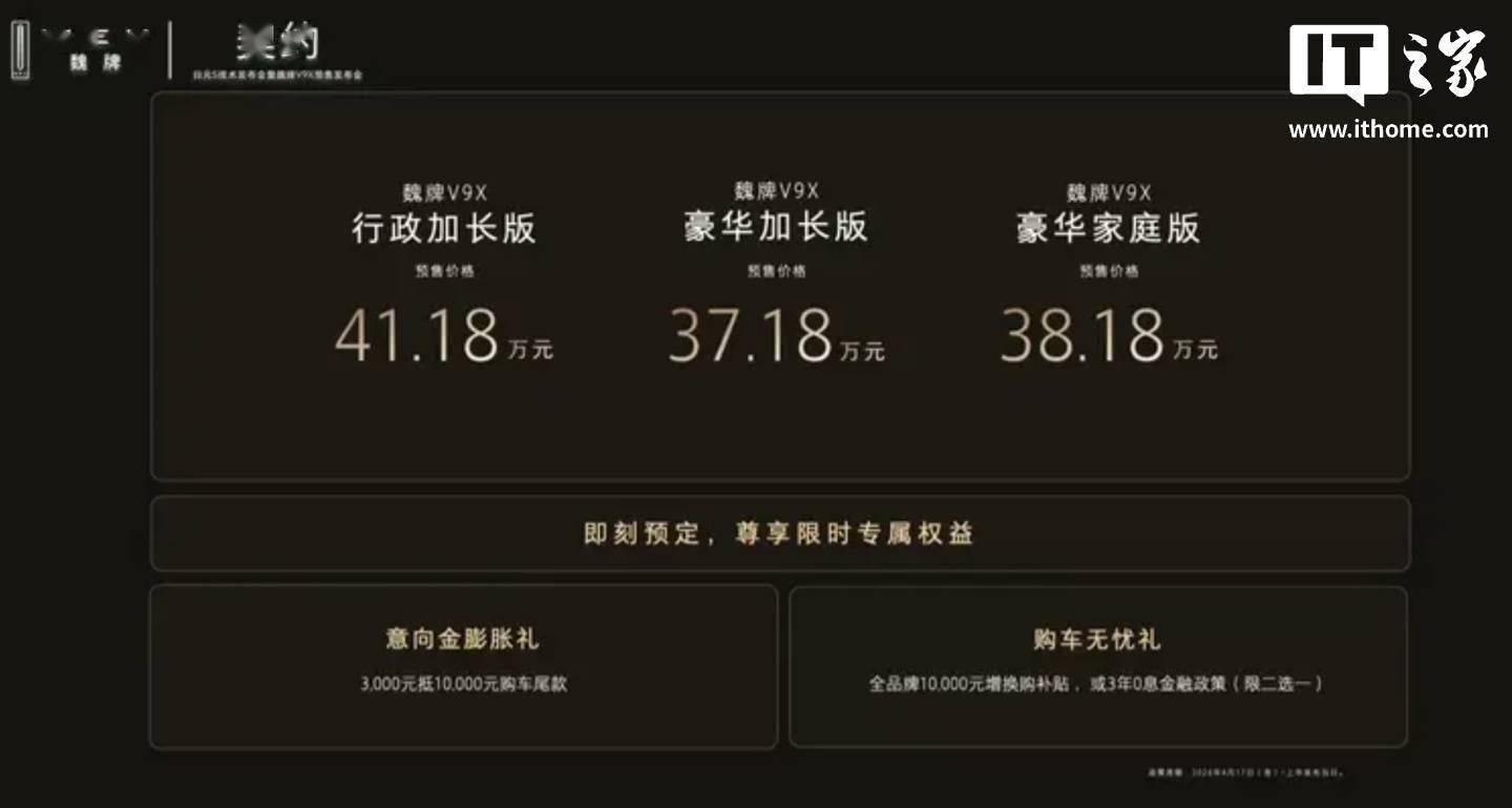 长城汽车旗下魏牌全新旗舰车型V9X今日正式开启预售,预售价37.18万元起。作为品牌首款基于归元S平台打造的车型,V9X以"AI豪华六座旗舰"为定位,通过混动技术、智能座舱与空间设计的创新融合,重新定义高端家庭出行标准。