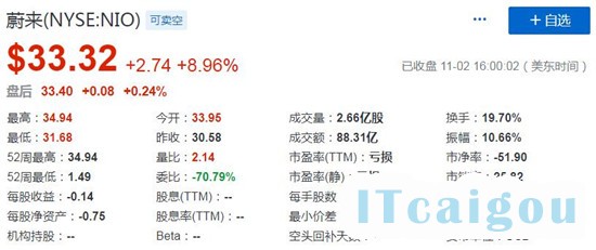 11月3日消息,蔚来股价涨势如虹,周一涨近9%至33.32美元,盘中最高达34.94美元,创新高。
