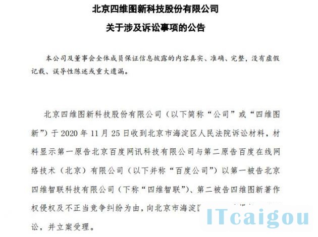 公告显示,四维图新于2020年11月25日收到北京市海淀区人民法院诉讼材料,材料显示第一原告北京百度网讯科技有限公司与第二原告百度在线网络技术(北京)有限公司(以下并称“百度公司”)以第一被告北京四维智联科技有限公司(下称“四维智联”)、第二被告四维图新著作权侵权及不正当竞争纠纷为由,向北京市海淀区人民法院提起民事诉讼,并立案受理。