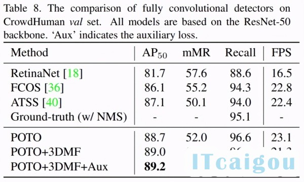 去掉 NMS 的最大收益其实是 crowd 场景,这在 COCO 上并不能很好地体现出来。所以又在 CrowdHuman 上做了实验如下: