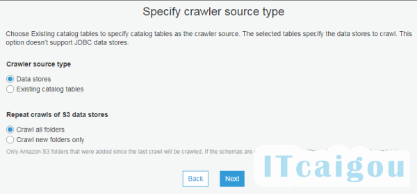数据湖中的所有数据都需要被数据目录所记录才可以使用,数据目录可以使用 AWS Glue 来爬取创建,下面我们配置数据目录爬取任务。