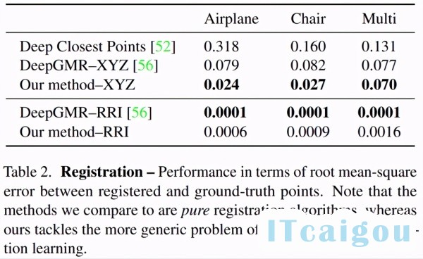 本研究采用的变体方法 RRI,其中使用 RRI 特征 [6] 作为该架构的唯一输入。本文使用 RRI 特征的方法遵循 DeepGMR 训练协议,并训练 100 个周期,而对于 DCP 和 DeepGMR,本研究使用了原作者的官方实现。定量分析的结果如下表 2 所示: