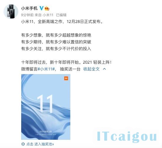 12月22日消息,小米手机官方微博正式宣布,小米全新高端之作——小米 11,将于 12 月 28 日正式发布。