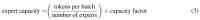 专家容量(每个专家计算的 token 数量)的计算方式为:每个批次的 token 数量除以专家数量,再乘以容量因子。如公式(3)所示: