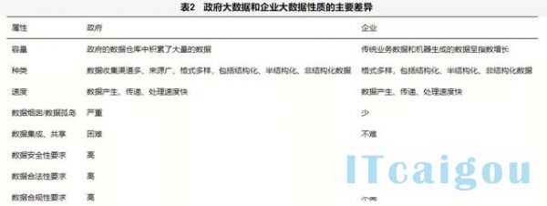 由于政府和企业性质存在差异,政府大数据和企业大数据的性质自然也存在差异,政府大数据和企业大数据性质的主要差异见表2。政府不仅要面对、处理由源头多、格式和价值密度不同导致的大数据集成的一般问题,而且还面临一些特殊的挑战。
