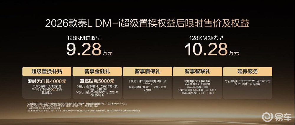 在中级轿车市场,秦L DM-i一直有着“工业奇迹”的美誉,如今2026款秦L DM-i正式登场,以智能、安全、舒适的新姿态,再次树立了中级轿车的新标杆。此次新车共推出2款车型,分别为128KM进取型和128KM领先型,官方指导价在9.68 - 10.68万元之间。而且在2025年11月30日24:00前完成购车开票的消费者,还能享受限时无门槛超级置换补贴4000元,补贴后售价仅9.28 - 10.28万元。