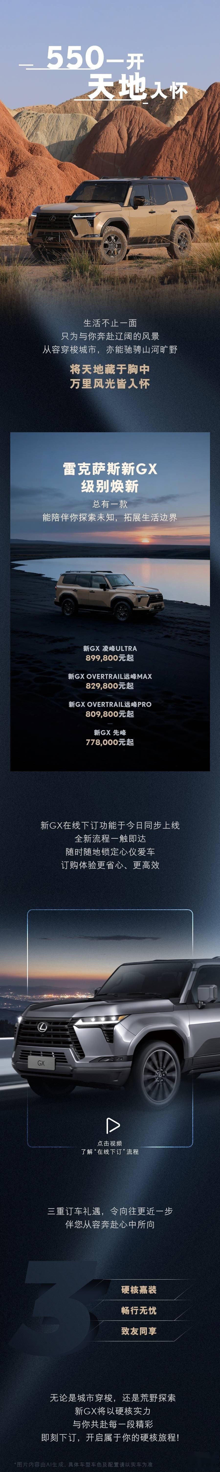 雷克萨斯全新GX车型正式登陆市场,此次共推出四款不同配置版本,官方指导价区间设定在77.8万元至89.98万元之间。消费者现已可通过线上渠道完成订购,开启个性化购车体验。