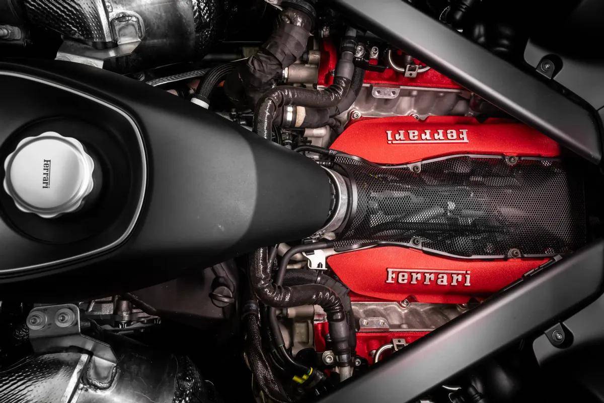 空气动力学设计是这款车的另一大亮点。其灵感源自1970年代Sports Prototype赛车,车身线条完全服务于气流管理。前脸加大的分流器为前轴增加10%下压力,重构的底盘前部贡献高达35%的下压力;车门被设计成巨大的空气导管,将气流精准导向中冷器,冷却效率提升30%;车尾的双尾翼结构与主动式扰流板协同工作,时速250公里时可额外产生100公斤下压力。最终,整车在相同时速下总下压力达415公斤,较SF90 Stradale提升25公斤。这些数据背后,是法拉利对功能导向设计的执着——每一处进气口、每一条轮廓均为性能服务。