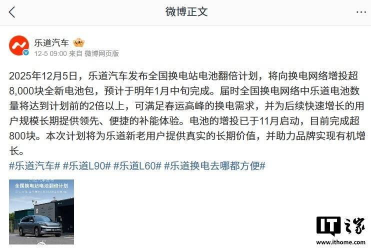 乐道汽车成立于2024年5月15日,是蔚来汽车面向大众市场推出的子品牌。今年10月18日,乐道品牌迎来重要里程碑,其第10万台新车正式交付用户,标志着品牌进入规模化发展阶段。此次电池增投计划是乐道为应对春运高峰及未来用户规模增长而推出的重要举措。